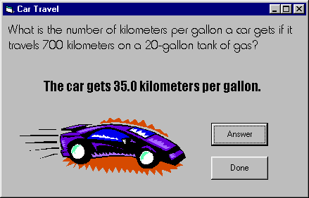 Create an application that calculates and displays the number of kilometers per gallon of gasoline a car gets if it travels 700 kilometers on a 20 gallon tank of gas. The application should display a car graphic. Use the Form_Load event to display “Click button for answer” in lblAnswer, and use the cmdAnswer_Click event to display the answer using a calculation and the Format() function.