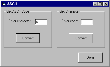 txtChar, txtCode, cmdConvertToCode, cmdConvertToChar, cmdDonefor the controls on the form. - Add code to