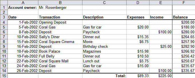 - In cell F5, type a formula that adds any income and subtracts any expense from the previous balance. Even if the income or expense cell is blank, include it in the formula in case the numbers change.