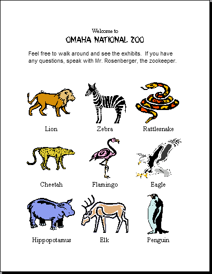 - Add a clip art image of a zoo animal to each of the nine squares. Change the captions to the proper names. If you need to resize the pictures, use the corner handles only so the image is not distorted. Some pictures will not be the exact shape of the grid; just make them as big as possible without distorting.